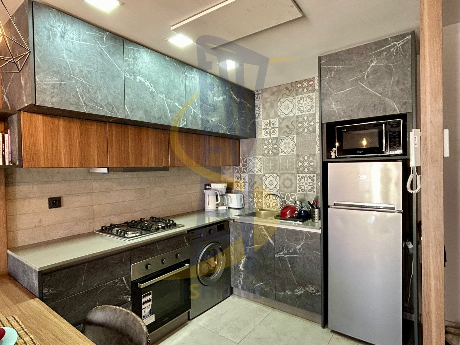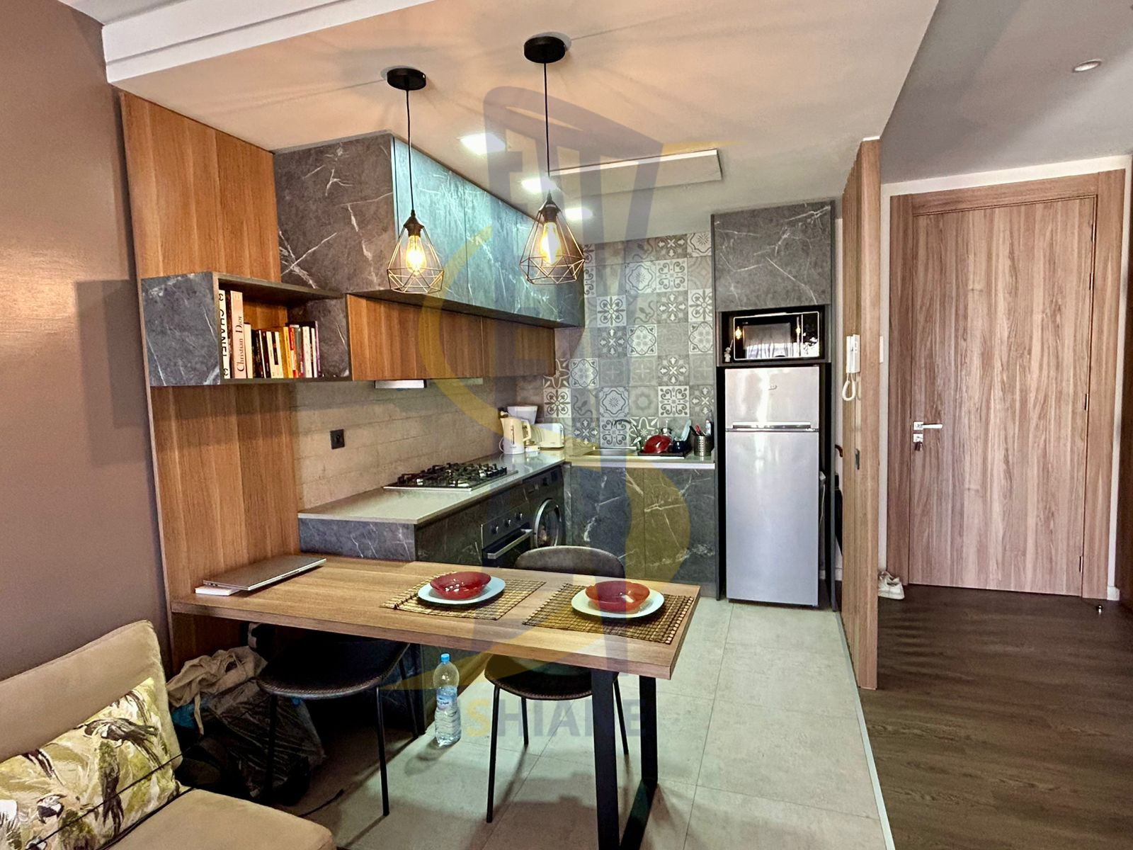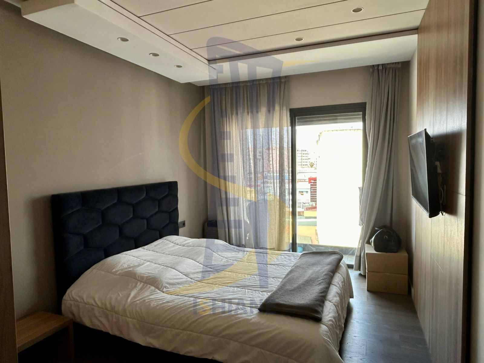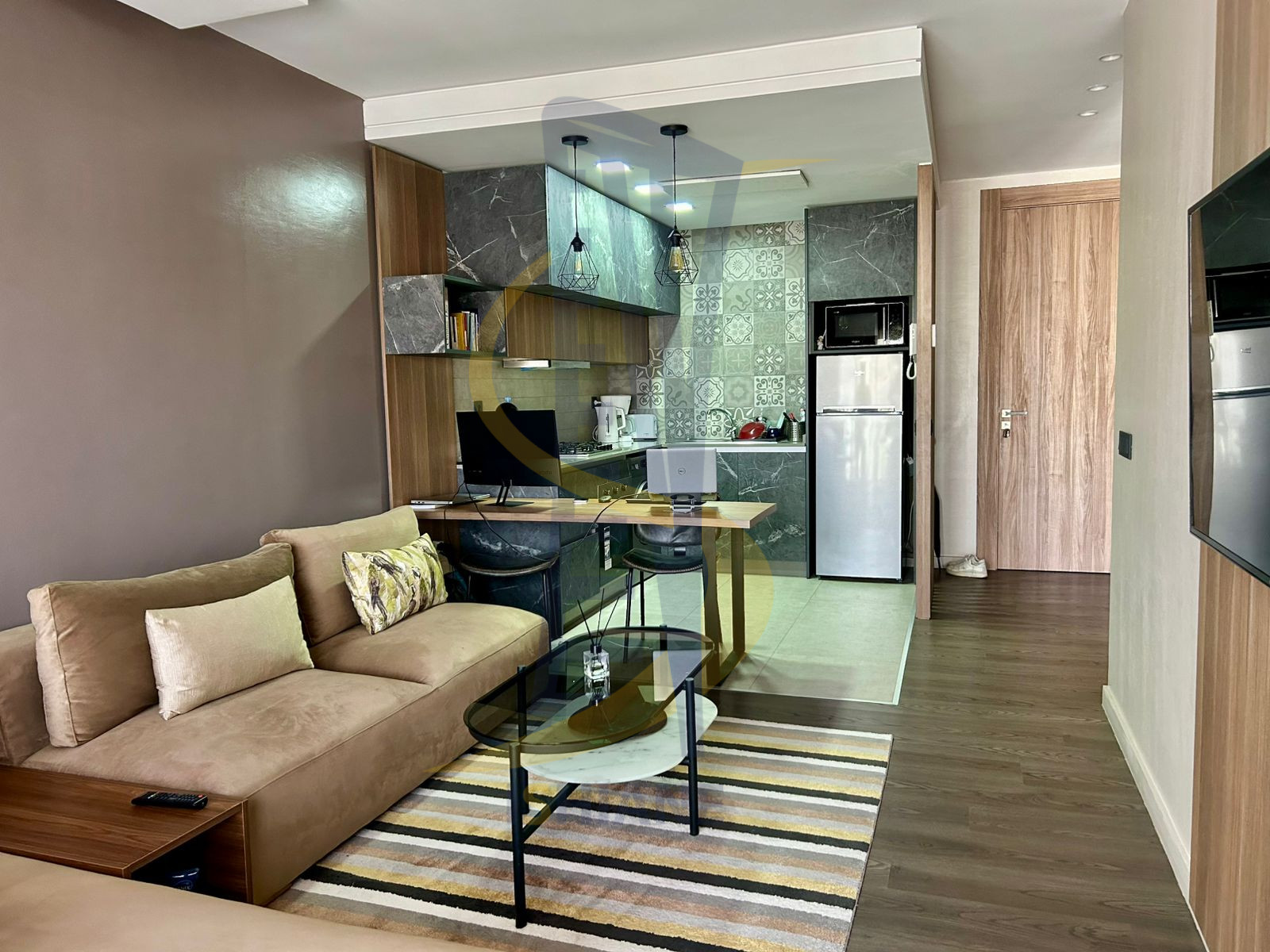 - La description: Studio pour location Meuble a Derb Omar, avec salon, cuisine américaine bien équipé, chambre a coucher et sdb. Situé au 4eme étage ,parking sous-sol . le prix inclus les frais de syndic et l'abonnement internet